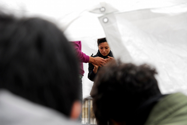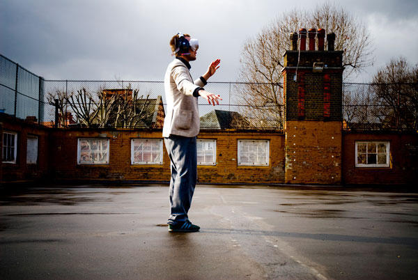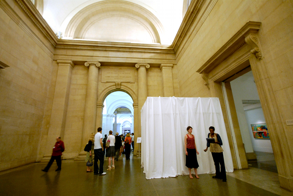 In the relatively simple piece My Voice Shall Now Come from the Other Side of the Room, a single visitor is presented with headphones and gently blindfolded with white out goggles. Instructions are given to the visitor by a ghostly and childlike voice within these headphones, and in perfect tandem to this voice are the gestures of unseen performers in the space: “I am here” it speaks as the visitor’s hand is gently caught by one of these invisible figures. Lasting only a few minutes, this strangely neutral space is disarming and calming, here is physical sensation at its purest distillation (1).