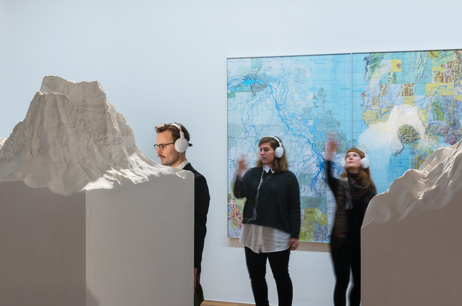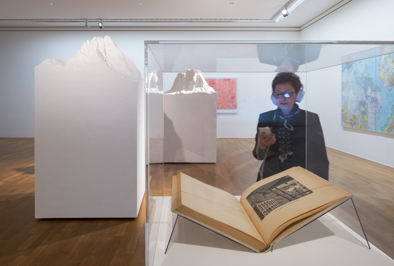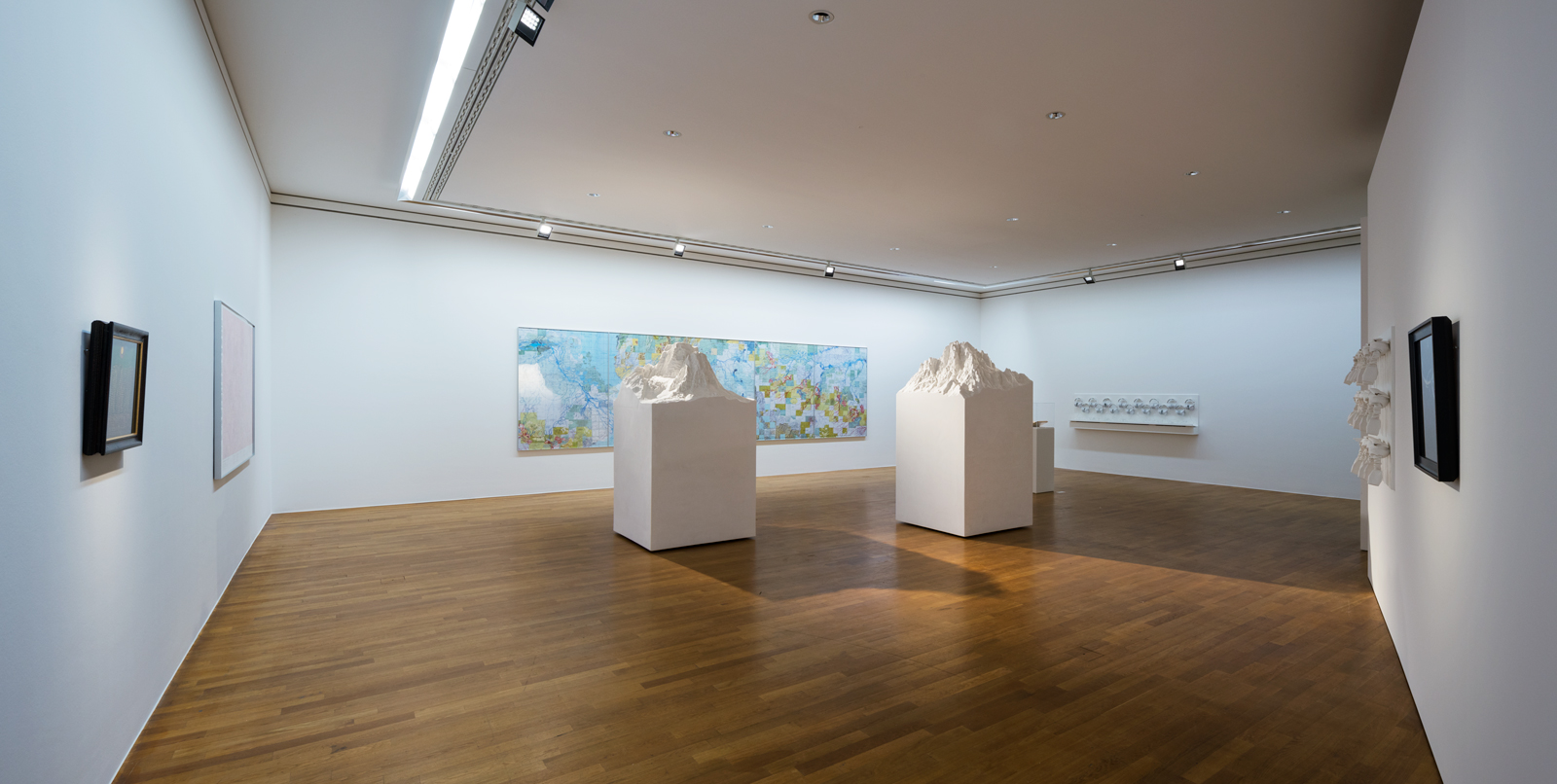 This exhibition is a complex installation: an interactional multi-sensory walk, with sound and light at its core. Stretching over several of Bonn Kunstmuseum´s large galleries the visitor is first led through the exhibition guided by text messages, sent to a provided cell phone, from an unknown sender called “the collector”. The exhibited works range, for example, from paintings by Max Ernst (a pioneer of virtual worlds) to a contemporary series of maps by Stephan Huber. After finding the entrance to a hidden corridor in the first gallery, the visitor enters stage two which does not involve any physical objects.