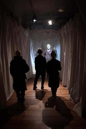 At first, visitors are accompanied by traces of voices from actors who performed in the building long ago (e.g. Harriet Bosse). Then, when the voice is located to a darkened stage and the visitor reaches out to touch the source of the sound ( or what seems to be the source ) the virtual interior image, visualised by the visitor, gets embodied by the touch of the physical hand, and the inner image projects out into the room - as if we could see what surrounds us in the void. Technology allows us to be with ghosts.