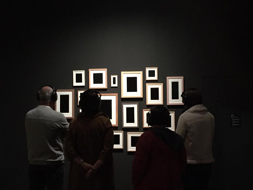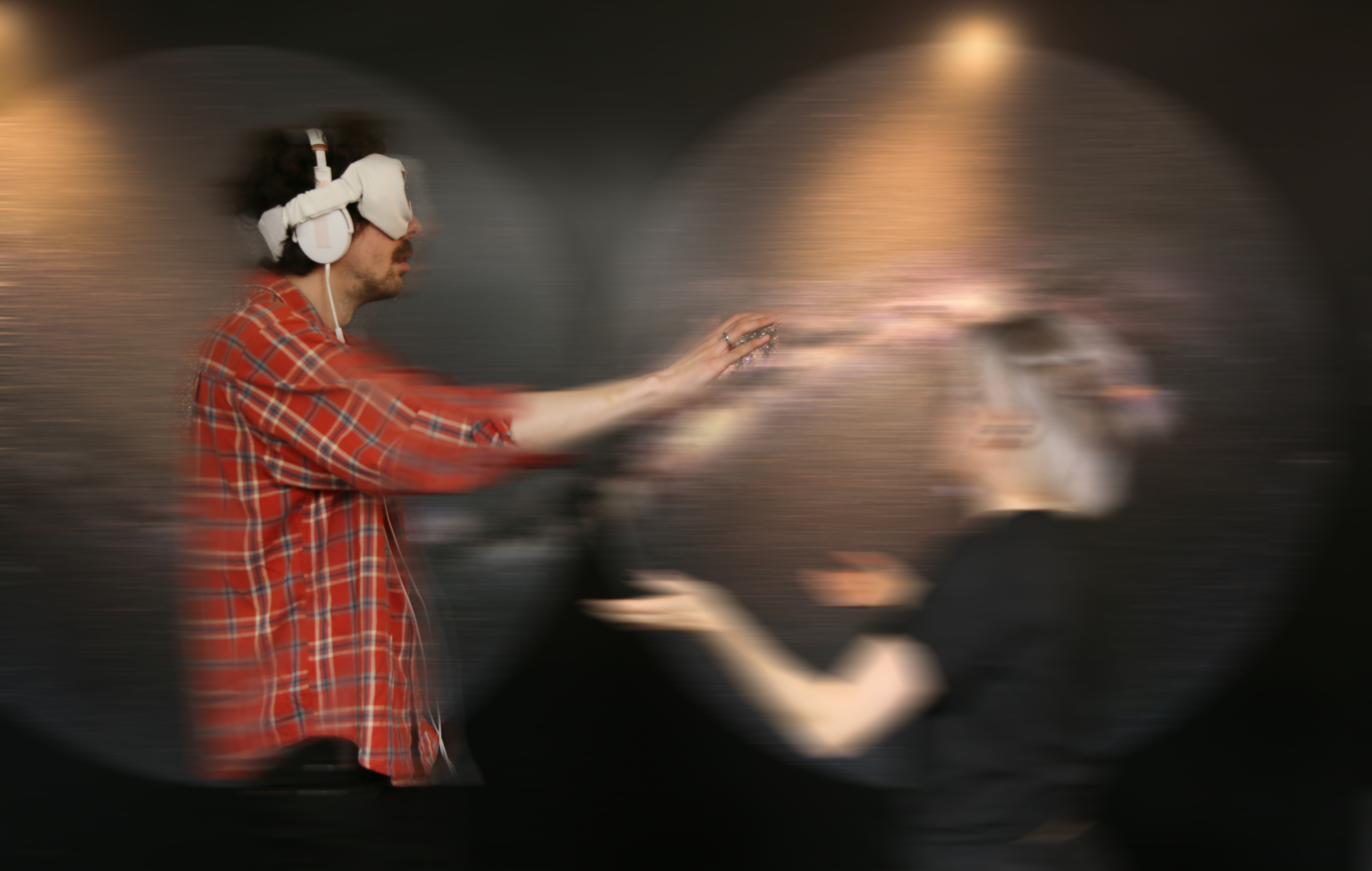 Although involving technology, this is not what defines the work. The virtual experience in the work is created through a combination of techniques. While wearing sightless goggles, the visitors are led into movement by an unseen performer. A three-dimensional sound in headphones, in combination with a precise choreography strengthened by a suggestive narrative description, starts a multisensory-binding loop between the body's nervous system and the imagined, through a reversed engineering of vision.